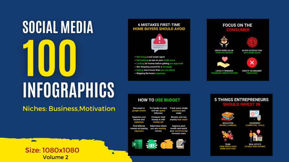 Our pack features 100 high-quality infographics in JPG format that are perfect for sharing on your social media accounts. Each infographic is carefully designed with eye-catching visuals and informative business-related content that is sure to grab the attention of your followers.
